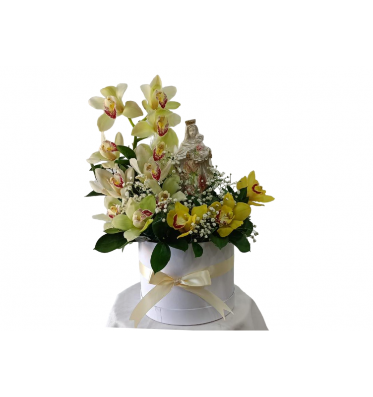 Arreglo floral especial para condolencias, con hermosas orquídeas y virgen.