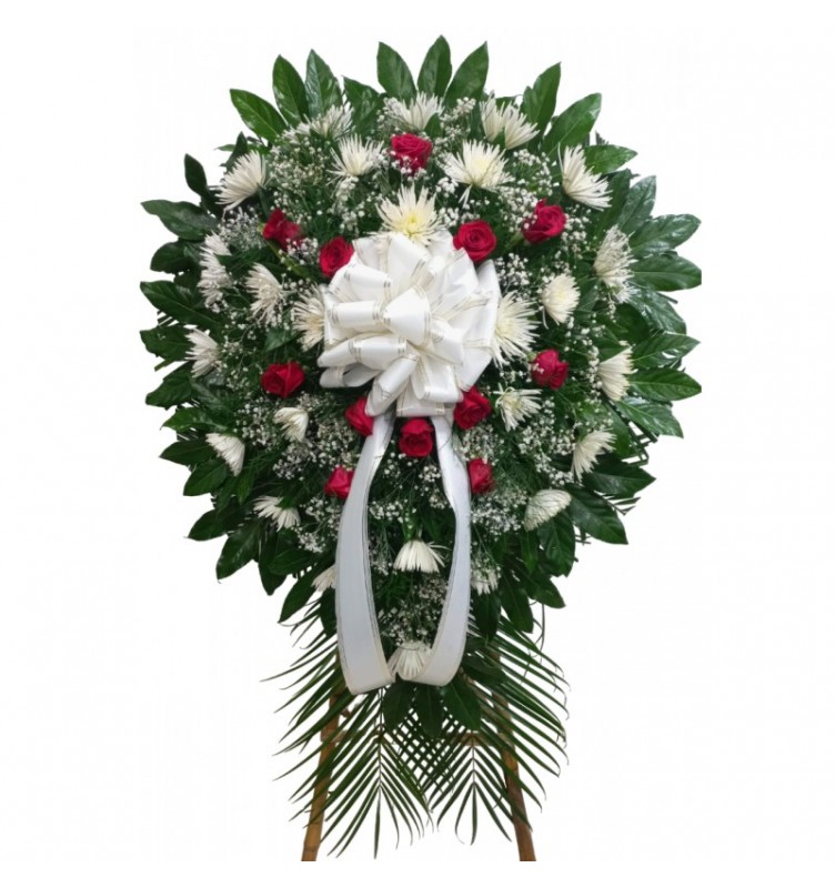 Pedestal de condolencias con crisantemos y rosas.