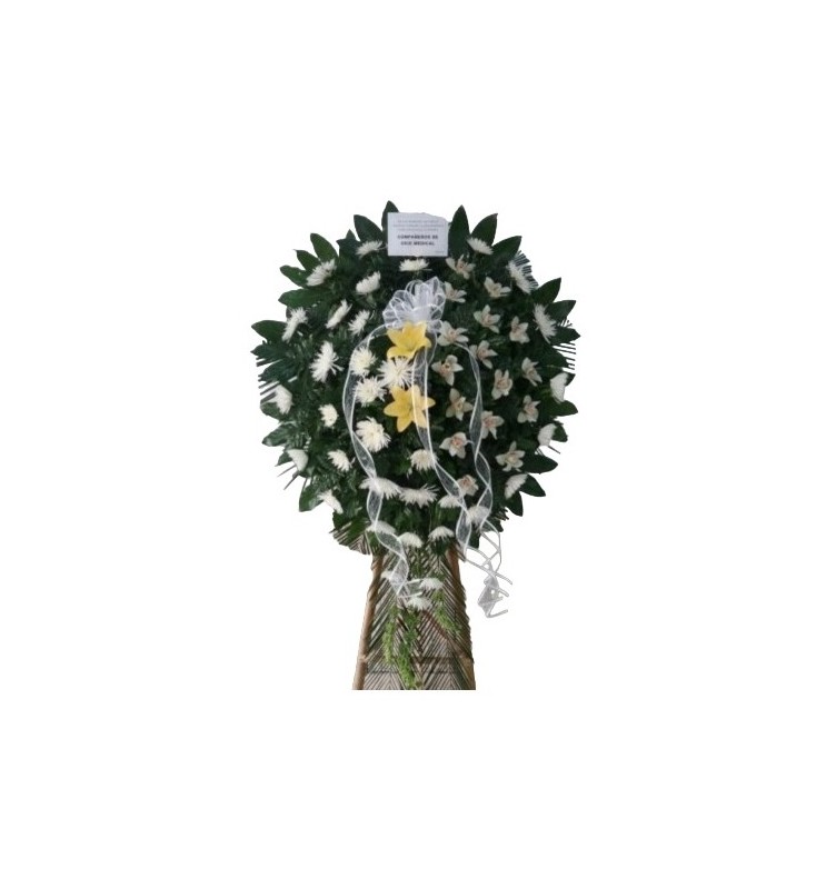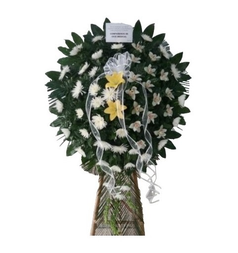 Pedestal fúnebre con crisantemos, orquídeas y lirios.