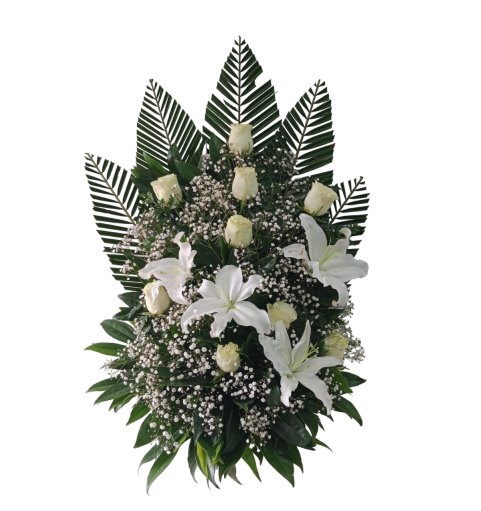 Acompaña a tus seres queridos con este magnífico arreglo floral elaborado con delicadas rosas y hermosos lirios.