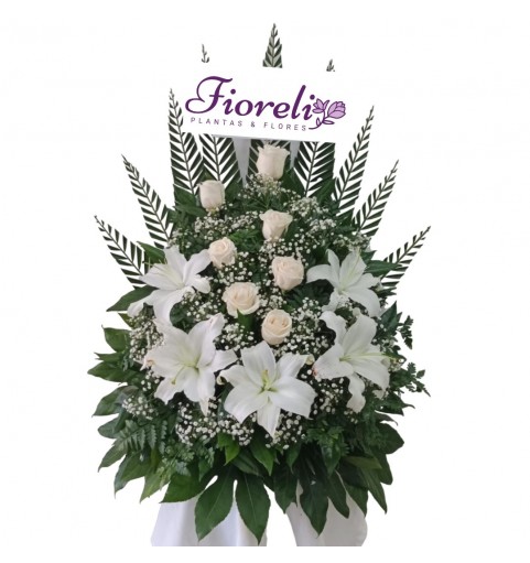 Elegante arreglo floral de condolencia con lindas rosas blancas y bellos lirios.